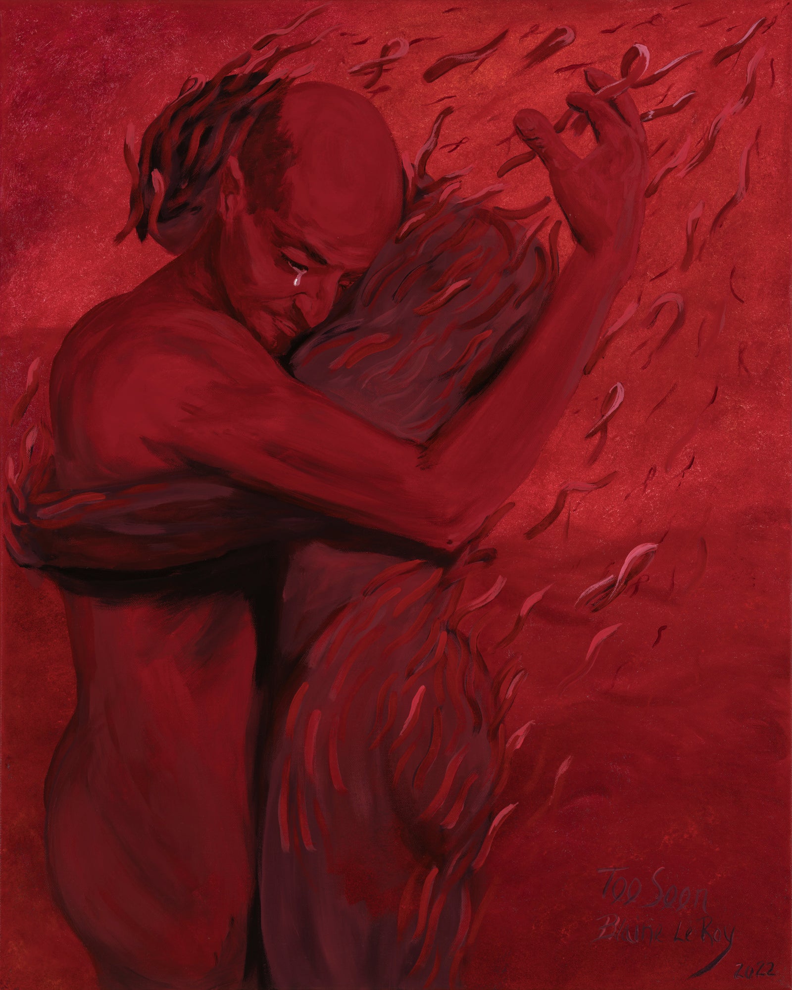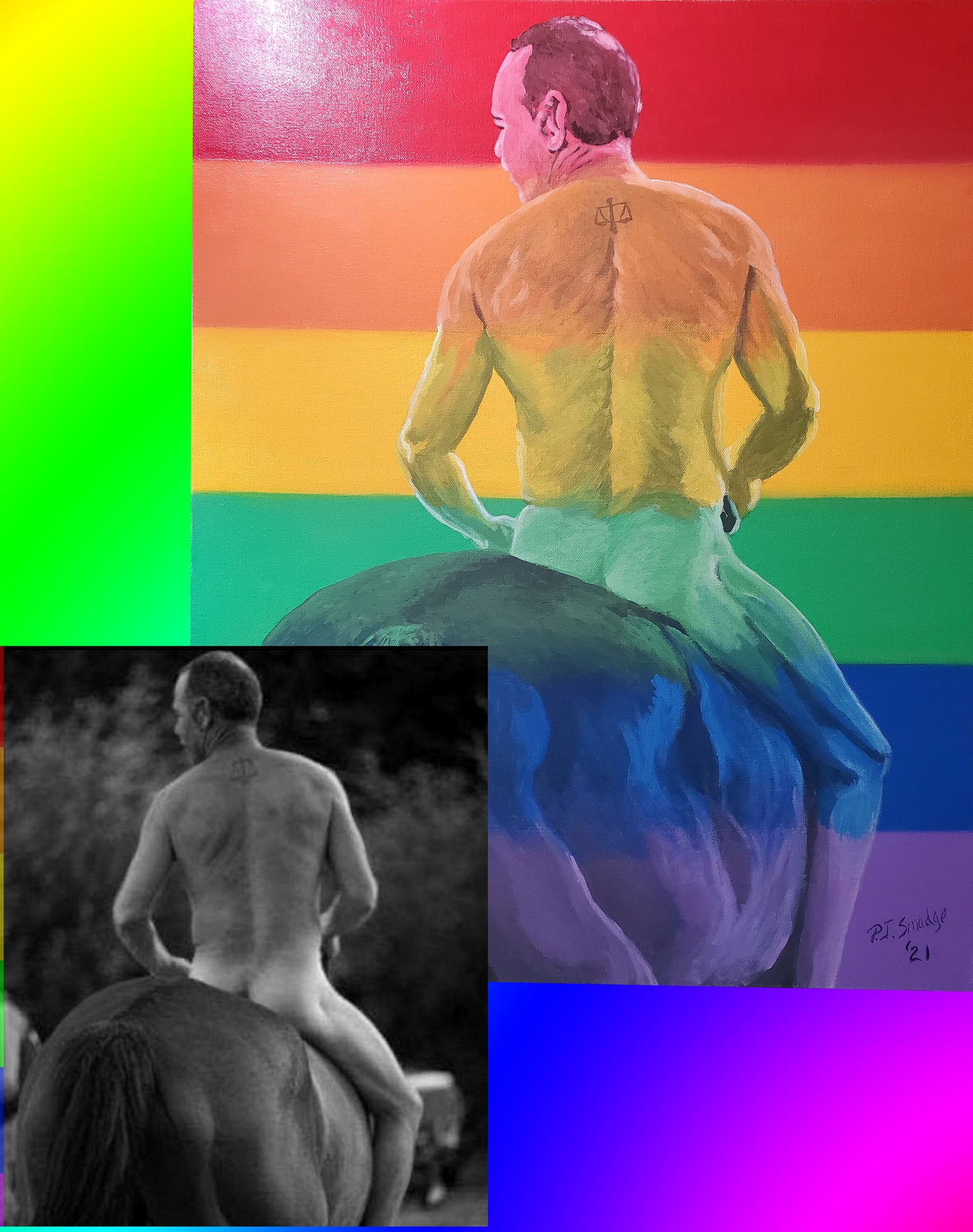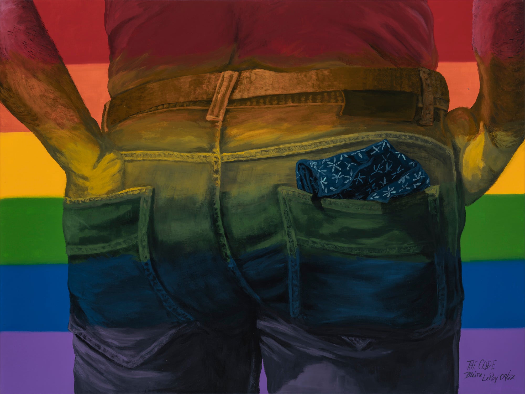 The Pride series actually came about accidentally. I had done a painting for a friend and wanted to do another for his husband, but the photo I had was in black and white. I didn't want to do a grayscale image since the previous painting was a bright colourful drag queen painting, so I decided to paint it over a rainbow flag. I put down the initial Rainbow background then added gray to the primary colours to paint the detail. I was so happy with the outcome it inspired me to start the series. I have always found too much LGBTQ art to be too overtly sexual, bordering on pornographic and I didn't want to do that. I wanted to pick ideas that were important to the history of gay culture and potentially unknown to younger members of the community, like the Handkerchief Code. The modern Grindr generation would have no idea what it was like to try and meet people and potentially be arrested for trying.